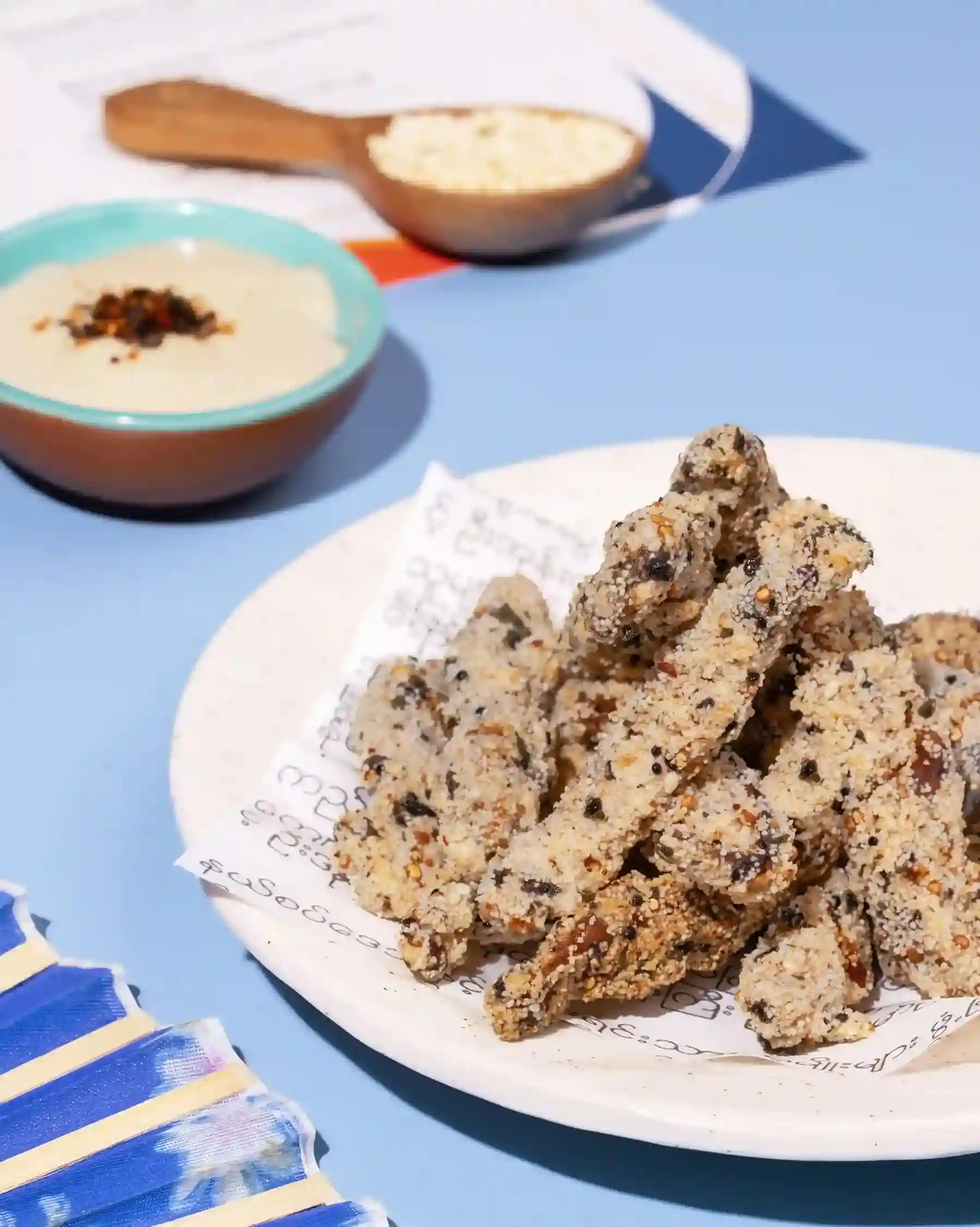 Shiitake mushrooms don’t grow natively across most of Burma. But forest-foraged mushroom varieties like oot por, pauk hpa, and da nyin gyi are widely used. In the monsoon season, Burmese home cooks and tribal communities frequently turn fresh mushrooms into fritters. They fry them tempura-style, coated with flour or flash-fry them with seasoning to whip up a quick snack for tea time. This custom of a crispy snack paired with tea is what inspires our Crunchy Shiitake Fingers.
