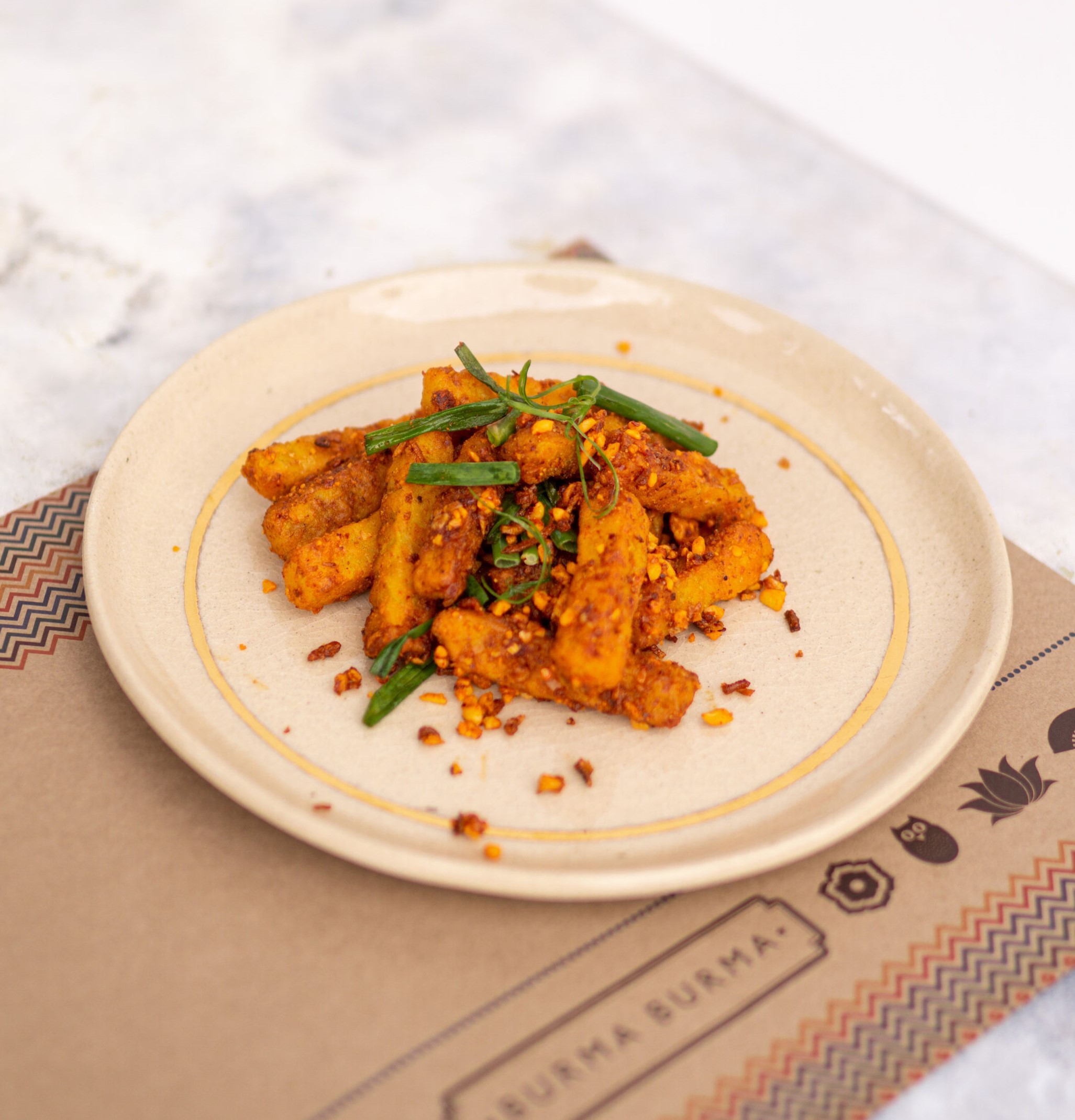 Add chopped spring onions along with Burma Burma’s Balachaung and give it a thorough toss to coat the potatoes.